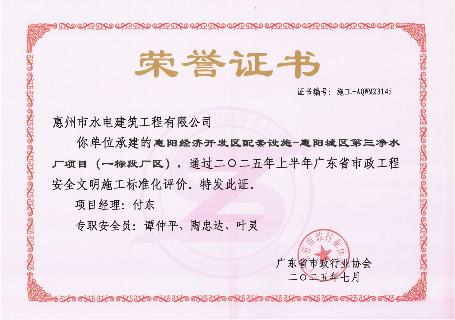 惠州市水電建筑工程有限公司成立于一九六四年四月,隸屬惠州市水務集團有限公司,是一家國有綜合性施工企業,主營水利水電工程、房屋建筑、市政工程等施工業務。公司擁有水利水電工程施工總承包一級、建筑工程施工總承包一級、市政公用工程施工總承包一級、公路工程施工總承包三級,公路路基、路面及建筑裝修裝飾專業承包二級,環保工程、機電安裝、河湖整治、輸變電工程專業承包三級等經營資質……